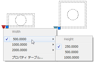 逆ルックアップのルックアップ プロパティでは、ダイナミック ブロック参照にルックアップ グリップが追加できます。このグリップをクリックすると、その列のルックアップ値のリストが表示されます。選択したリスト項目と対応する入力プロパティの値がブロック参照に割り当てられます。