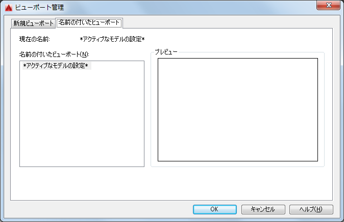 新しいモデル空間ビューポート設定の名前を指定します。名前を入力しない場合、作成したビューポート設定は適用されますが登録されません。ビューポート設定を登録しないと、レイアウトで使用できません。