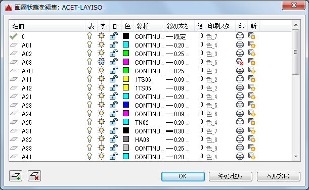 選択した画層状態に保存されているすべての画層とそのプロパティが表示されます。