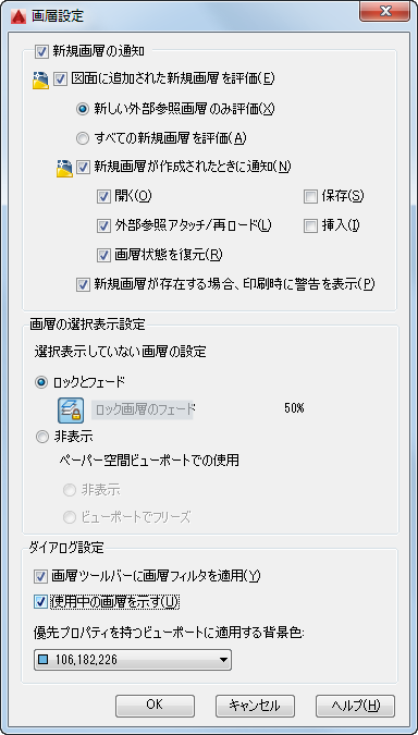 新規画層が作成されたときの通知のタイミング、一部の画層が選択表示されたときの画層の動作、画層フィルタを[画層]ツールバーに適用するかかどうか、また[画層プロパティ管理]で優先プロパティを持つビューポートの背景色をコントロールします。