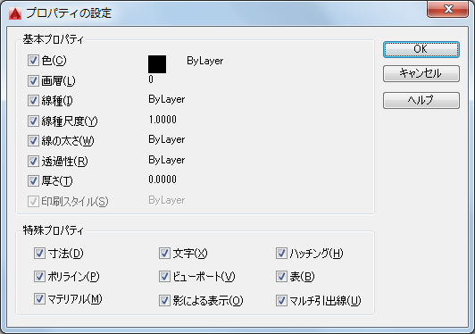 オブジェクトの基本プロパティの他にも、コピー先オブジェクトの寸法スタイルおよび異尺度対応プロパティをコピー元オブジェクトと同じプロパティに変更します。寸法、引出線、幾何公差オブジェクトでのみ使用できます。