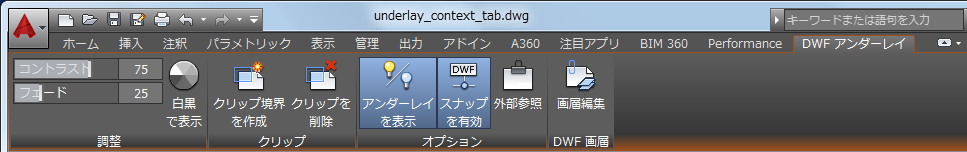 図面内の DWF アンダーレイを選択すると、[DWF アンダーレイ]コンテキスト タブがリボンに表示されます。