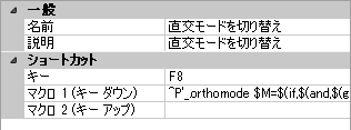 • [マクロ 2 (キー アップ)]ボックスに、一時優先キーを放したときに実行されるマクロを入力します。値を定義しない場合、キー アップすると、アプリケーションと図面の設定は前の状態(一時優先が実行される前の状態)に復元されます。