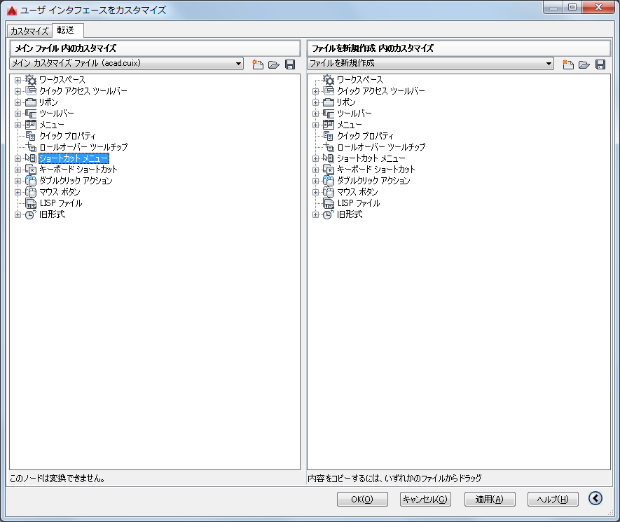 コマンド プロンプトで CUIIMPORT と入力すると、メイン CUIx ファイルが右ペインに表示されます(既定値では、AutoCAD ファイルの場合は acad.cuix、AutoCAD LT ファイルの場合は acadlt.cuix)。データを転送するには、CUI ファイルまたは旧形式のカスタマイズ ファイルを左ペインに開きます。コマンド プロンプトに対して CUIEXPORT と入力すると、メイン CUIx ファイルが左ペインに表示されます。データを転送するには、他の CUIx ファイルまたは旧形式のカスタマイズ ファイルを右ペインに開きます。