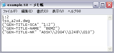 標準読み込み(*.tit)ファイルは、AMTITLE コマンドで読み込むことができる、図面枠と表題欄の情報が格納されているテキスト ファイルです。