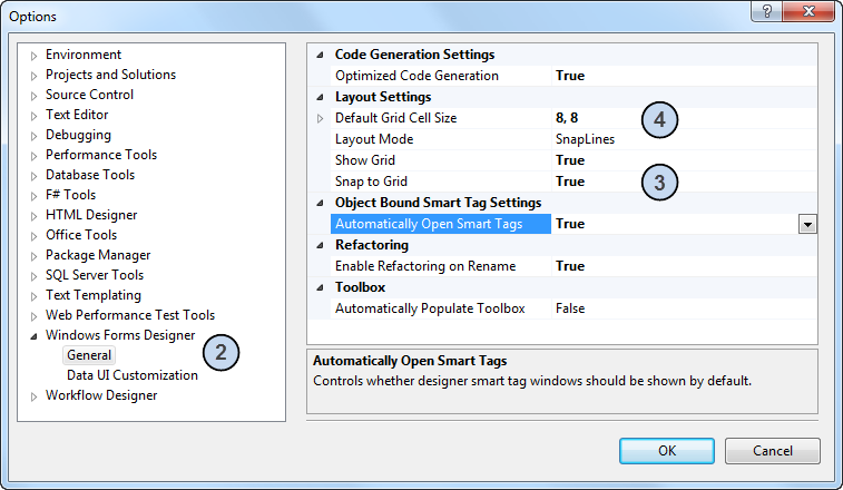 フォームにコントロールを追加するには、[ツールボックス]ウィンドウで目的のコントロールをクリックしてツールをアクティブにし、Windows フォーム デザイナのフォーム上をクリックしてコントロールを配置し、サイズを調整します。[オプション]ダイアログ ボックスで、[Windows フォーム デザイナ]フォルダの下の[全般]カテゴリから適切な設定フォームを設定することによって、コントロールをグリッドや他のコントロールと位置合わせすることができます。[全般]カテゴリでは、サイズやレイアウト モードなど、グリッドに関連するその他の設定をコントロールすることができます。