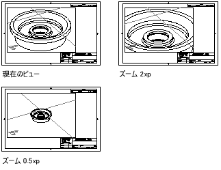次の図は、尺度が 1:1 のモデルのビューと、同じモデル ビューの 2:1 の尺度と 1:2 の尺度を示します。2:1 の尺度では、モデルのビューをペーパー空間の 2 倍単位に拡大します。1:2 の尺度では、実サイズの半分のサイズでモデルを表示します。
