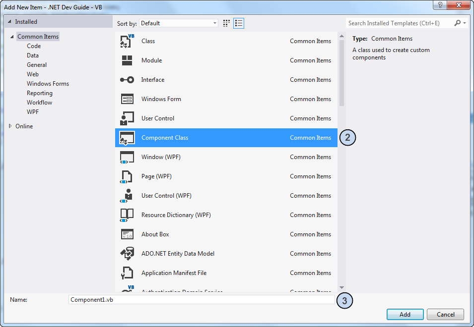 クラス モジュールや Windows フォームなどの新しい項目をプロジェクトに追加できます。その際に、項目のプロパティ(名前など)を更新したり、適切なコードを入力する必要があります。新しい項目に名前を付けるときは、今後のアプリケーションで他の開発担当者がその項目を使用する可能性があることを念頭に置いておく必要があります。社内で決められた命名規則や Microsoft が設定した標準に従う必要があります。