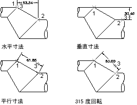 長さ寸法は、平行または回転のいずれかにすることができます。平行寸法では、寸法補助線の起点間を結ぶ線分と平行に寸法線が描画されます。回転寸法では、寸法補助線の起点と一定の角度に寸法線が描画されます。
