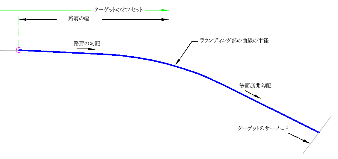 路肩は、アタッチメント ポイントからラウンディングの勾配変移点(PVI)までで計測されます。PVI とターゲット サーフェス間の距離が十分ではなくラウンディング部の曲線をうまく作成できない場合は、ラウンディング部の曲線の値が適合するように調整されます。ラウンディングされた路肩のジオメトリを定義することができます。