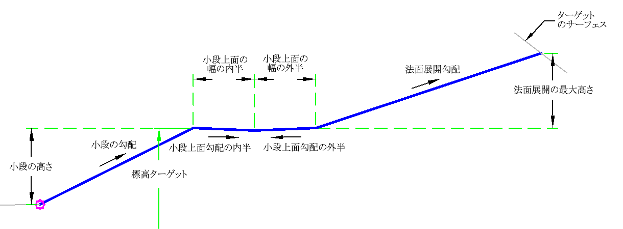 法面展開の最大高さを指定します。挿入ポイントとターゲット サーフェス間の垂直距離が、指定した法面展開の最大高さよりも大きい場合は、指定した小段の高さ、勾配、グレーディング、幅を使用して小段が作成されます。この操作はターゲットの標高が見つかるまで繰り返し実行されます。