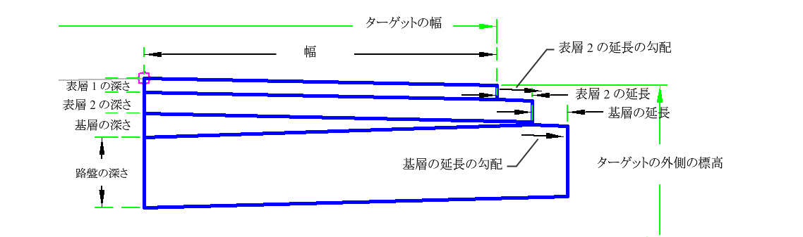 [路肩の幅]と[既定の路肩勾配]の指定値を基に、路肩の表層を、アタッチメント ポイントから外側の方向に挿入します。次に、表層 2 のポイントとリンクが描画されます。表層 2 の延長は、入力パラメータを使用して作成されます。基層のポイントとリンク(延長部分も含む)は、入力パラメータを使用して計算されます。路盤のポイント、リンク、シェイプ(延長部分も含む)は、入力パラメータを使用して計算されます。
