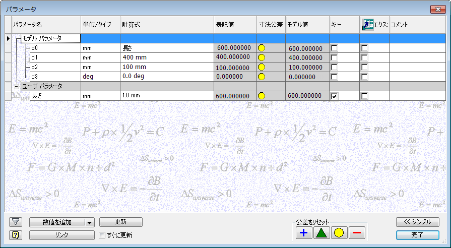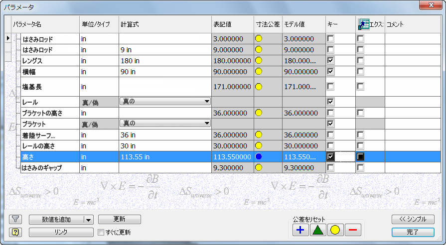 | [パラメータ] | バリアントに指定された値 | モデル内の実際の値 |