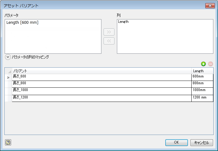 をクリックして、テーブル内の最初のバリアントを作成します。このバリアントの名前がバリアント リストに Variant_1 と表示され、[長さ]列に 600 mm が表示されます。