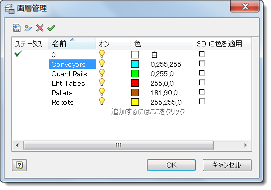 画層を使用すると、ダイアログ ボックスで、Inventor Factory レイアウトの 3D アセットの画層の作成、名前変更、表示のオン/オフの切り替え、色の割り当て、削除を行うことができます。画層は既存の DWG からインポートすることもできます。