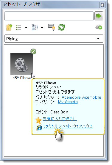 ボタンを使用します。コレクションを追加すると、新しいフォルダが作成されます。このフォルダは必要に応じて、作成時に名前を付けたり、後で名前を変更することができます。 クラウドにパブリッシュされたアセットは、[アセット ブラウザでダウンロードできるようになります。Factory Asset Warehouse には、クラウドベース アセット用のブラウザを介してアクセスすることもできます。