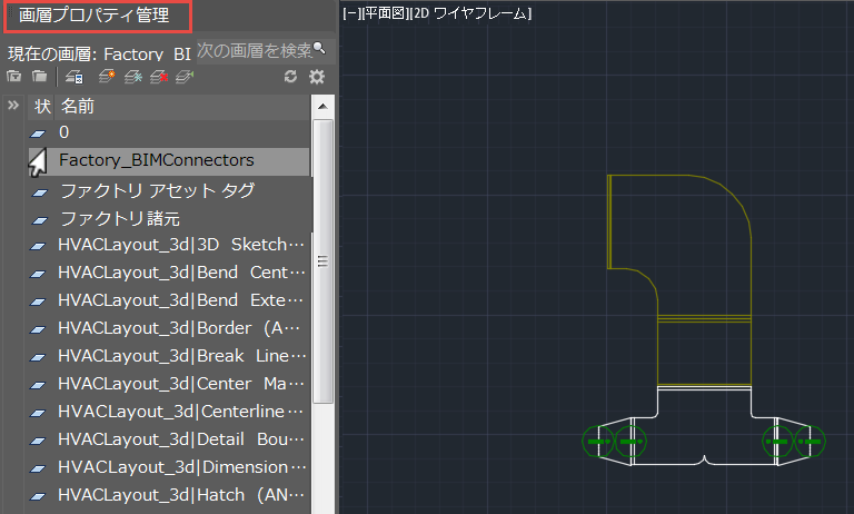 [画層プロパティ管理]で、ファクトリ BIM コネクタを表示することもできます。[画層プロパティ管理]にアクセスするには、コマンド ラインに LAYER と入力します。