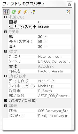 - [諸元]: アセットの簡単な説明です。[諸元]には、製造元、モデル名、モデル番号など、アセットに関する一般情報が記述されています。アセットをコピーするたびに、同じ諸元が割り当てられます。追加諸元には、アセットに関する追加情報が含まれています。たとえば、「バリアント付きの直線コンベア」の場合、このアセットのバリエーションがアセットの配置時に選択できることを示します。