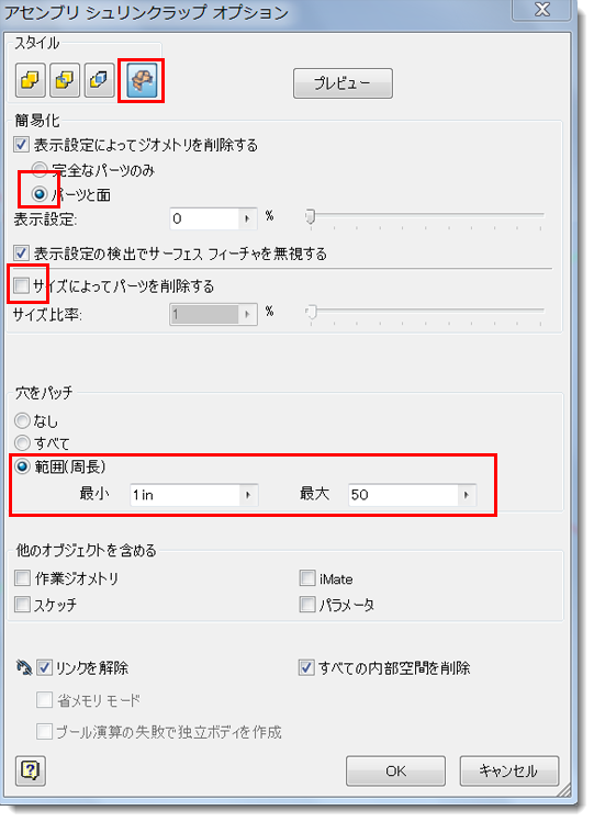 [アセットに変換]コマンドでは、シュリンクラップ フィーチャを使用して、ファイルを簡略化します。軽量のモデルを正常に作成する上で、簡略化オプションの適切な設定は非常に重要です。