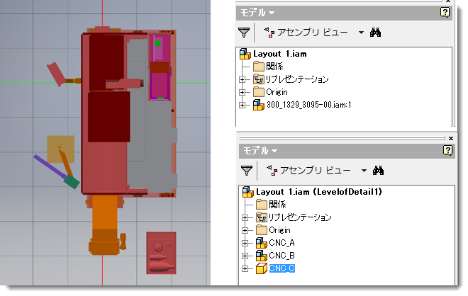- すべての項目が目的に沿って構成されるまで手順 2 を繰り返します。この例では、3 つの項目(CNC_A、CNC_B、CNC_C)をアセットに変換し、項目の関係を維持するようにファイルが再構築されます。