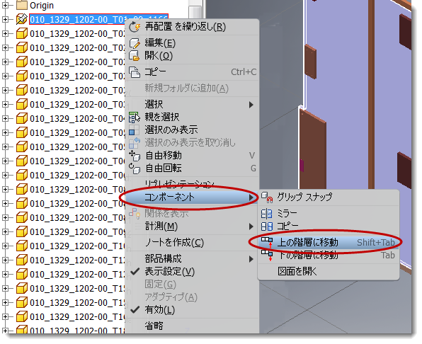 - アセットに変換する項目を特定します。右クリックして[コンポーネント]を選択し、[上の階層に移動]を選択します。