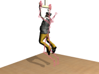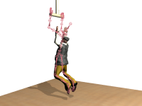Reach 設定は、キャラクタの複数の異なるノードの位置と向きに対して設定することができます。リターゲット ソルバでは、これらのすべての Reach 設定の競合する要件のバランスが調整され、最終的に生成されるポーズを元のアニメーションの配置に合わせる方法が決定されます。異なる Reach 設定間のこのバランス調整により、コンタクト ポイントを徐々にブレンドすることができます。たとえば、上の例のキャラクタが立っているポーズで始まり、跳び上がって空中ブランコをつかむ場合、Reach 設定は足のコンタクト ポイントを優先に開始し、手のコンタクト ポイントの優先度を徐々に増やし移行する必要があります。そのとき、アニメーションは空中ブランコをつかむと考えられます。