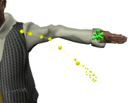 この状況に対する一般的な方法は、適切なエフェクタ(この場合は右手)のトランスレーションと回転を適切な最終位置に設定することと、Reach 設定をアニメートすること、そして各フレームで Reach 値を増加させることです。 最初のフレームでは、元のフォワードキネマティクス アニメーションを変更せずに、Reach 値をゼロから開始する必要があります。キャラクタの移動の最終フレームでは、Reach の制御が、キャラクタの手から最終ゴールまで描画して、最大値に達する必要があります。間の各フレームでは、Reach の制御は、ゴールに向けてスムーズな移動を生成し、ゼロと最大値の間を補間する値に設定される必要があります。