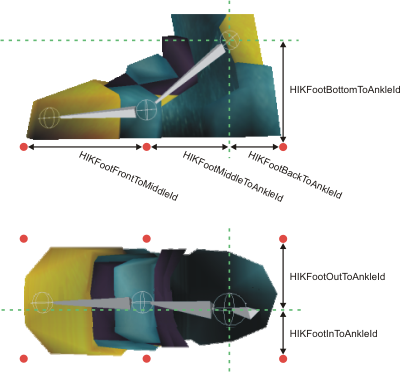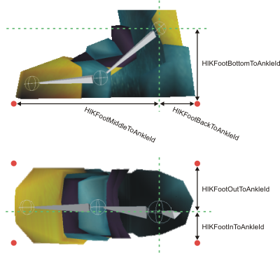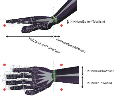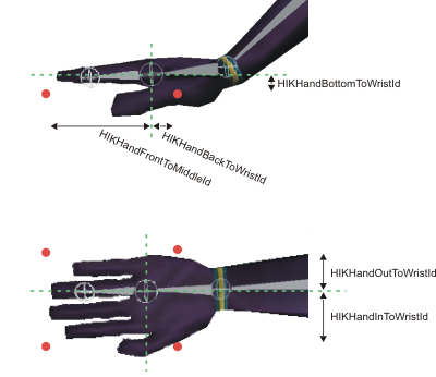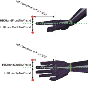 HumanIK によってコントロールされている足または手のジョイントがキャラクタにない場合、マーカーの位置は、足首と手首のジョイントに対して相対的に決定されます(LeftAnkleNodeId、RightAnkleNodeId、LeftWristNodeId、RightWristNodeId の各ノード)。