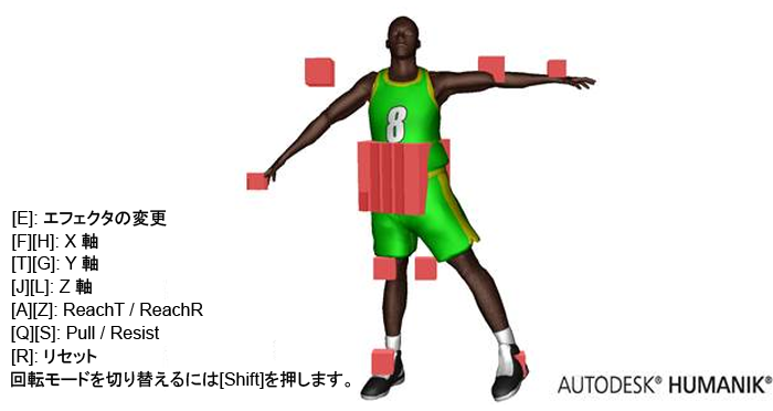 FullBodyIK サンプルでは、HumanIK のフルボディ インバース キネマティクス ソルバの視覚的なインタフェースが提供されます。キャラクタ用のアニメーション セットを、キャラクタのエフェクタに指定した位置、方向、IK コンストレインに従ってオンザフライで変更できます。キーボード コマンドについては、下図を参照してください。