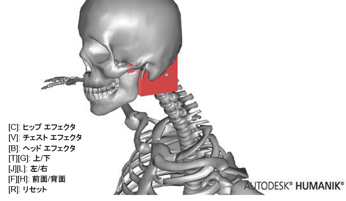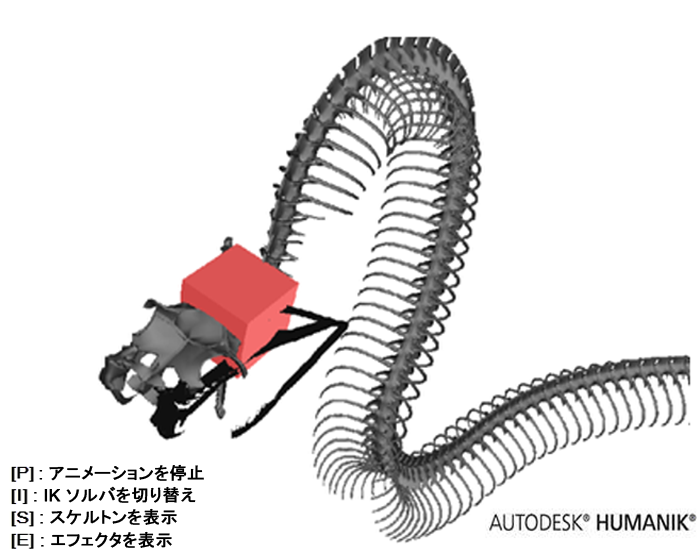 Squash and Stretch サンプルでは、首と脊椎の収縮と伸長を有効にするための HumanIK のセットアップ方法を示します(HumanIK 2014 で導入)。キーボード コマンドについては、下図を参照してください。