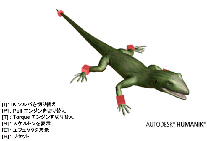 HumanIK では Quadruped で FullBodyIK を実行することができます。Quadruped サンプルでは、四肢動物のリアルなフロア コンタクト動作が得られるようにお使いのデータを設定する方法を示します。キーボード コマンドについては、下図を参照してください。