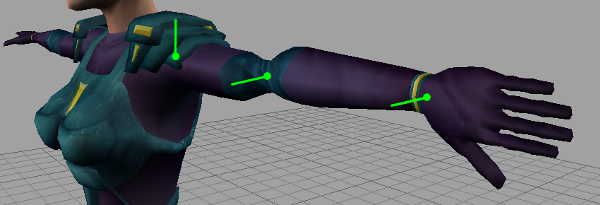 たとえば、次の図では、キャラクタの左手首のエフェクタが 90 度前方にロールしており、Reach Rotation 値が 1 に設定されています。 この手首のノードのリーチを、目的の回転にするため、HumanIK はロール回転を肘のノードに適用します。緑色のラインが、肩、肘、手首のノードのローカル Y 軸の大体の方向を示しています。