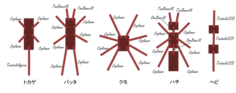 クリーチャーは、「チェーン」と「セクション」という 2 つのベース要素を組み合わせて構成されます。チェーンは手足(または触覚、尻尾、触手、下顎など)、または首や背骨などの 2 つのセクション間をつなぐリンクになります。セクションを持たないクリーチャーを作成することもできます(IK をそのボディ全体ではなく、手足にのみ実行する場合)。セクションは中枢的なボディ パーツです。それらはいくつかのチェーンの接合点と考えることができます。チェーンは完全に伸びた状態に達するとセクションを引き寄せる場合があります(「FullBodyIK」と呼ばれます)。