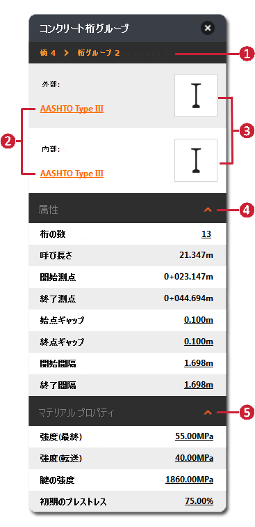 桁グループは、内部桁および外部桁を含む橋コンポーネントです。桁グループを選択して、材料プロパティを確認して修正したり、桁グループのギャップおよび間隔を調整します。