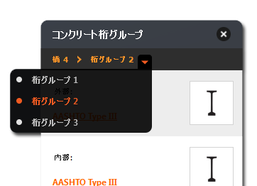 - ブリッジまたは桁グループ名の上にマウス カーソルを合わせて、目的の橋または桁グループを表示、選択します。