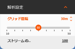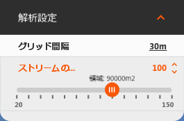 [グリッド間隔]では、河川でサンプリングする正方形グリッドのサイズをコントロールします。 値を調整して、サンプリングするグリッド正方形を小さくすると、小さい支流を識別しやすくなりますが、さらに解析が必要になります。たとえば、既定の正方形 30m X 30m を調整して 15m X 15m にすると、解析規模は 4 倍になります。 値を大きくすると大きい河川や流域を高速で検索できますが、小さいものを見落とす可能性があります。 |