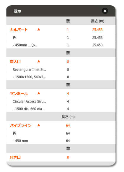 選択した設計道路にある排水溝フィーチャの数量情報がテーブルに一覧表示されます。