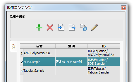 標準インタフェースのアイコン ツールを使用して、降雨ファイルの追加、削除、読み込み、書き出しを行うことができます。また、選択した降雨コンテンツのコピーを作成し、そのコピーを[IDF 降雨]ウィンドウで編集することもできます。
