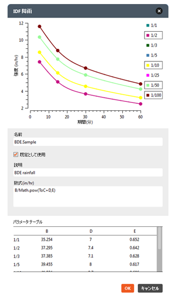 ([降雨コンテンツ]ツール)により、モデルの排水設計で必要となる最適な IDF 曲線を指定することができます。 このツールの概要については、「概要 - 降雨コンテンツ」を参照してください。