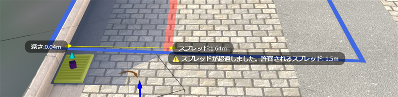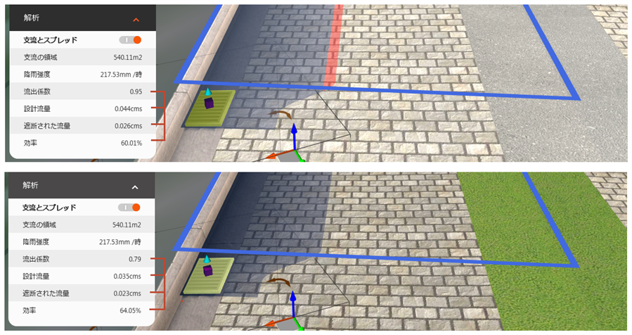 流入口の解析では、コンポーネント道路で使用される異なる種類のマテリアルの流出係数における差異が考慮されます。以下の比較では、アセットカードの解析データに、傾斜したアスファルトの中央分離帯を植栽された中央分離帯に置き換えた場合の影響が表示されています。流入口と各種条件は同じです。アスファルトの中央分離帯を使用した場合のスプレッド値が、スプレッドの推奨値を超えていることに注意してください(赤の領域)。この場合、植栽された中央分離帯に切り替えると、この状態が修正されます。