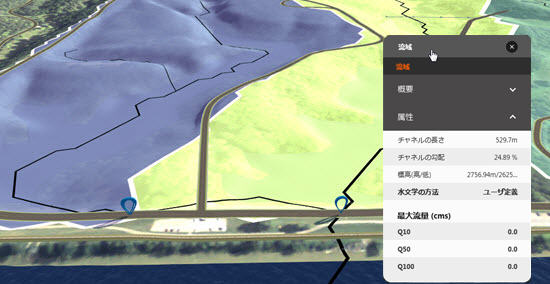 - 1 つの解析が複数の流域を識別することがあります。各流域は、選択可能なフィーチャです。ある流域の内側をクリックすると、そのアセット カードが表示されます。