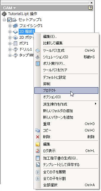 操作をプロテクトするには、CAM ブラウザで操作を右クリックし、ポップアップ コンテキスト メニューから[プロテクト]を選択します。同様に、[プロテクト]をもう一度選択することで保護を解除することができます。一度保護を解除すると、操作は自動的に無効とマークされ、再作成が必要になります。