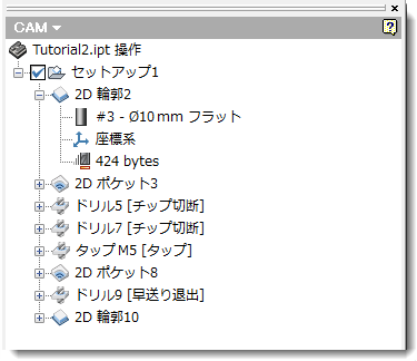 CAM ブラウザは、すべてのツールパスのプレースホルダです。すべてのツールパスは、物理セットアップ(作業座標系など)について記述するセットアップ フォルダ内に整理されます。完全なプログラムは、実際に生成されたツールパス(カッター位置情報)が含まれる 1 つまたは複数の操作で構成されます。より複雑なセットアップでは、操作をサブフォルダに整理した方が役立つことがあります。