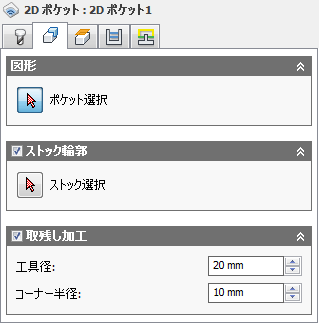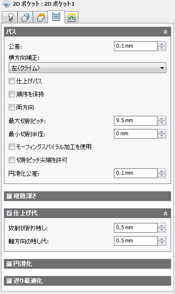 [正の仕上げ代]: 後続の粗取りまたは仕上げ操作で削除すべき、操作後の残りストックの量です。粗取り操作のために、既定値は少量の材料を残します。