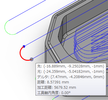 ツールパスの他の任意の点の上にマウスを移動します。ツールチップに、座標、デルタ距離(X、Y、Z)、スペース内の距離、加工距離が表示されます。