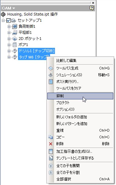 操作を省略解除するには、CAM ブラウザから選択して右クリックし、ポップアップ コンテキスト メニューからもう一度[抑制]を選択します。次に、[生成]コマンドを使用してツールパスを再生成します。