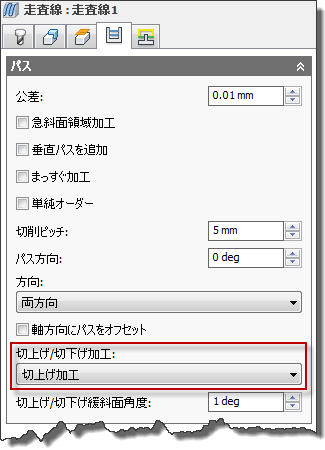 ペンシル、スキャロップ、走査線、放射状、渦巻きなどの加工方法では、Z で上下に移動するツールパスを生成します。使用する工具によって、切下げまたは切上げのみを行うことができます。これは、Inventor HSM Express では[切上げ/切下げ加工]ドロップダウン メニューがあるこの[パス]タブでコントロールできます。
