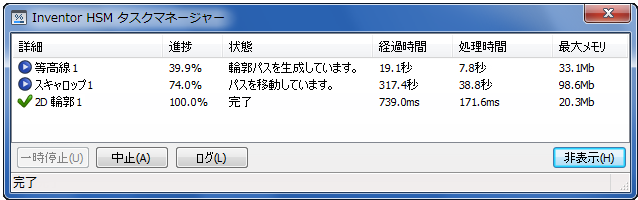 既定では、タスク マネージャは残りのユーザ インタフェースをブロックします。これにより、Inventor HSM Express と Inventor の残りは非アクティブになるため、すべての CPU リソースをカーネルで使用することができます。ただし、生成完了まで待機しない場合は、ダイアログ ボックスの[非表示]ボタンをクリックします。これにより、ツールパスがバックグラウンドで計算されている間も、作業を続行することができます。