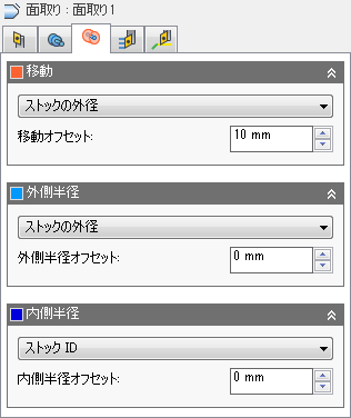 放射状仕上げ代を変更すると、軸方向の仕上げ代を手動で入力しない限り軸方向の仕上げ代に同じ量が自動的に設定されます。