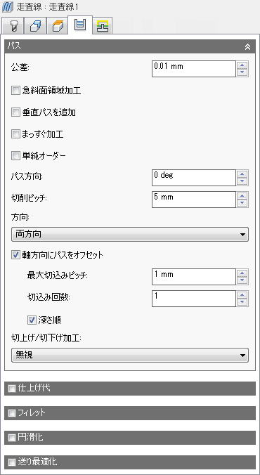 パス間の水平切削ピッチを指定します。既定ではこの値は、工具コーナー半径を差し引いた、カッター直径の 95% です。